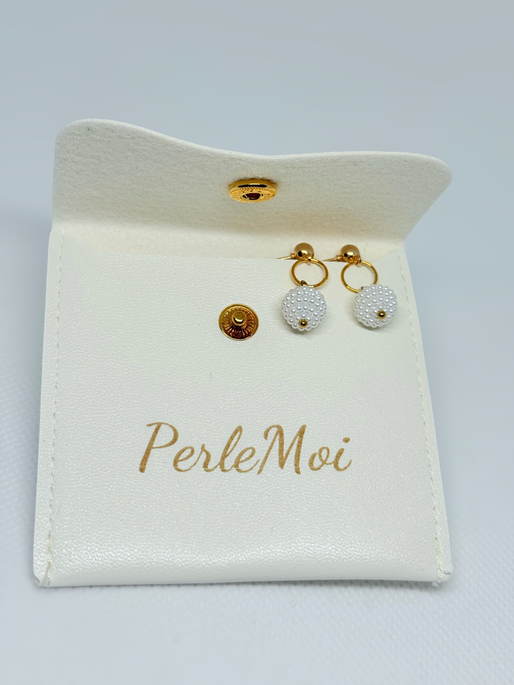 Pochette à bijoux blanche avec fermeture dorée.